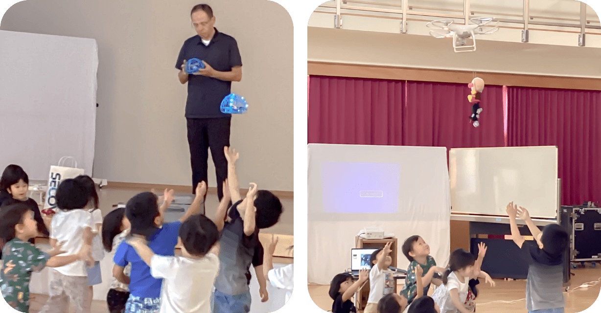 ドローンを使ったあそびを取り入れ、子どもたちの好奇心や興味を引き出しています。 頭上を飛ぶドローンを見上げながら、「触れそうで触れない」距離感の中で、楽しみながら体を動かします。 ワクワクする体験を通して、集中力や反応力を自然と育てていきます。
