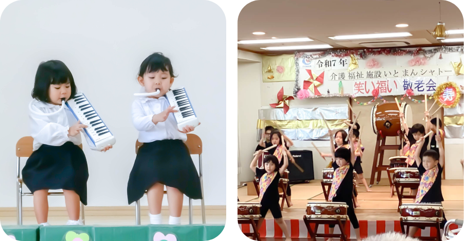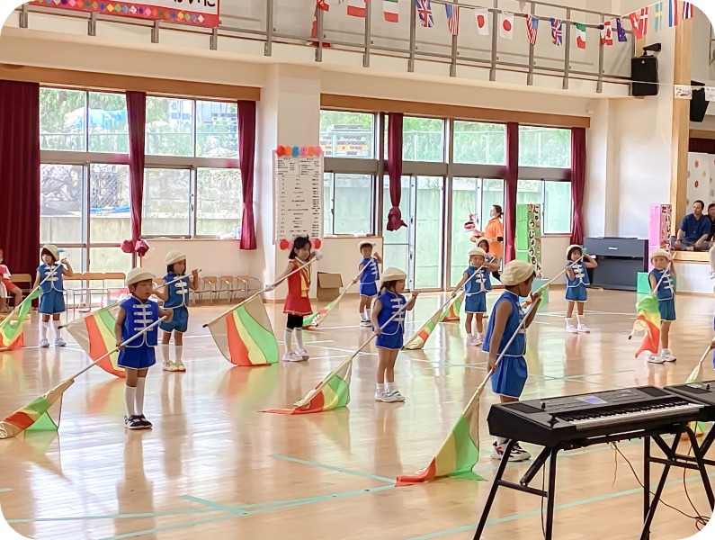 太鼓を使った活動や、うちなぁの歴史・文化に触れながら、音やリズムを楽しむ保育を行っています。 歌ったり体を動かしたりする中で、子どもたちは自然とリズム感や表現力を身につけていきます。 音楽に親しみながら、「歌が好き」「リズムあそびが好き」という気持ちを大切に育てていきます。