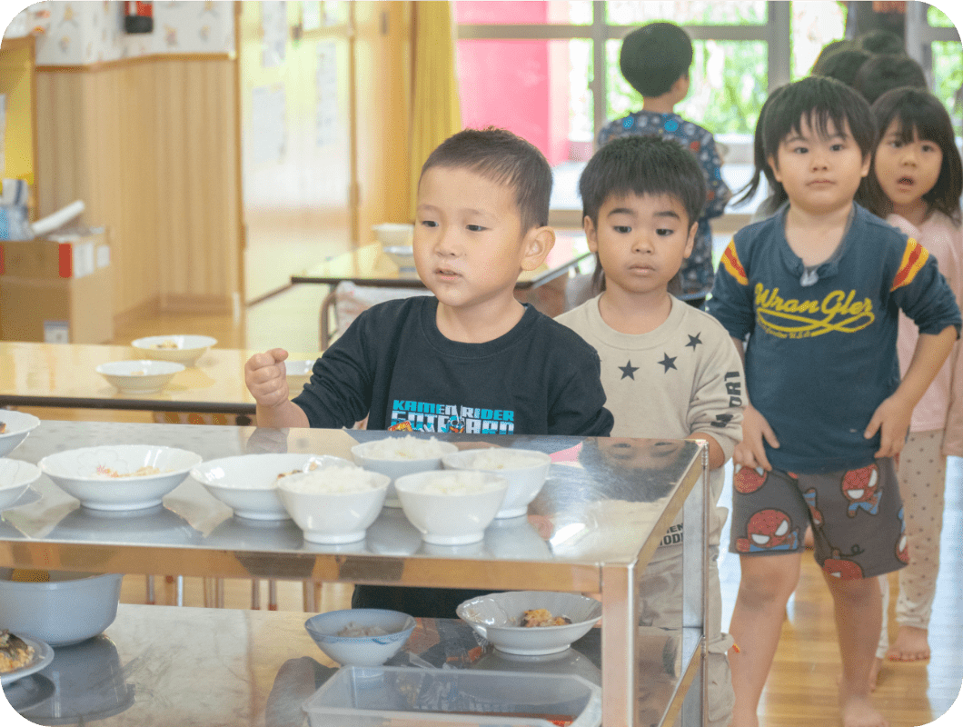 当園では、園内の調理室でその日の給食やおやつを一つひとつ丁寧に手作りしています。 子どもたちの成長や健康を第一に考え、栄養バランスや食材の安全性にも配慮した食事を提供しています。 できたての温かい食事をみんなで楽しむことで、食べる喜びや大切さを育んでいきます。