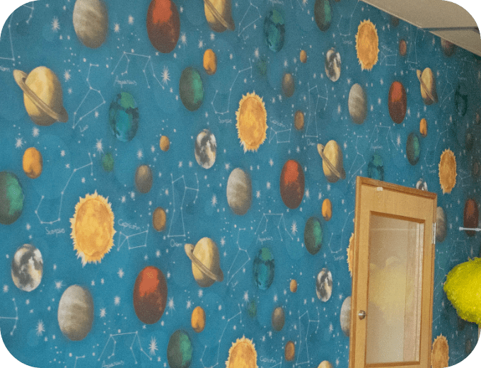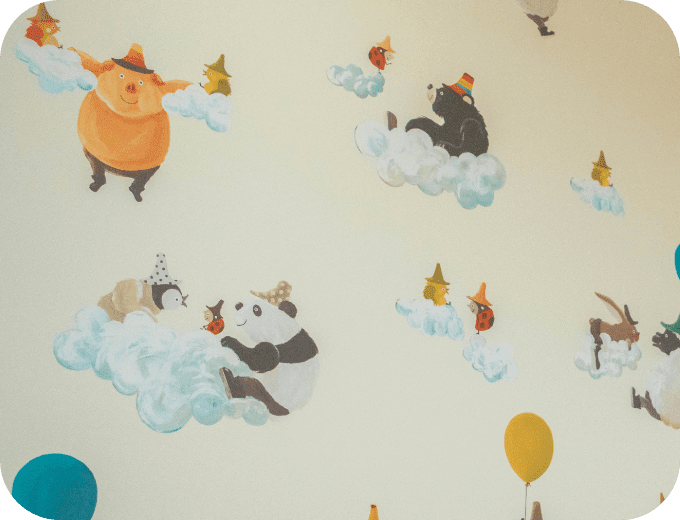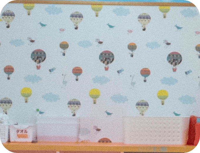 各教室ごとに異なるデザインの壁紙を採用しており、それぞれのお部屋に個性があります。動物や風景など、見ているだけで楽しくなる空間の中で、子どもたちは毎日を過ごしています。 環境づくりにもこだわることで、子どもたちの興味や想像力を自然と引き出していきます。